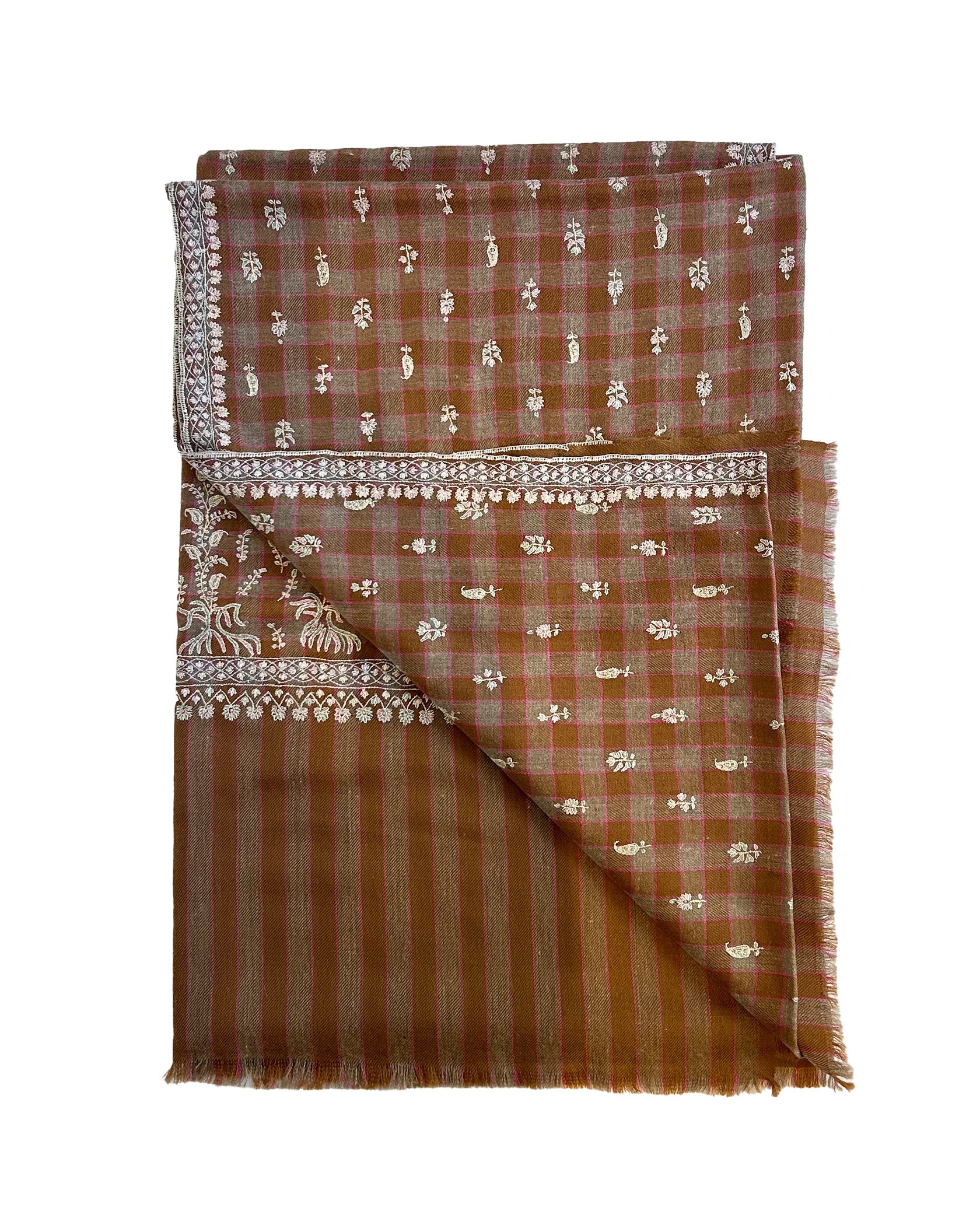 Handwoven from 100% pashmina wool, this Kashmir-crafted shawl features an intricate mini flower embroidery design layered over a rich mustard brown plaid base. Meticulously created by skilled artisans using traditional techniques, it elevates any look.